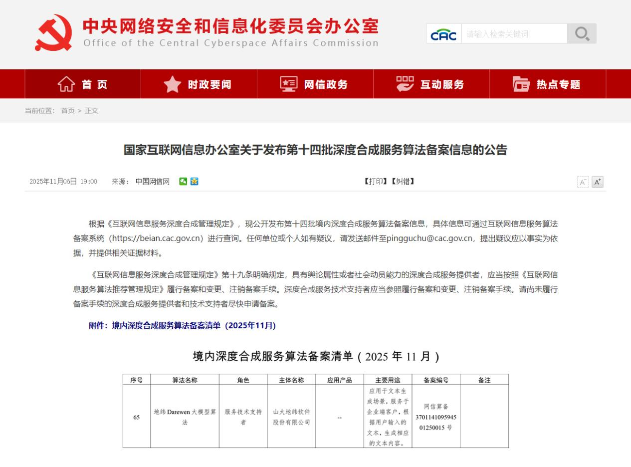 近日,国家互联网信息办公室发布第十四批深度合成服务算法备案信息,山大地纬公司“地纬Darewen大模型算法”在数据安全、隐私保护、算法透明度等方面满足国家相关法律法规要求,顺利通过备案。