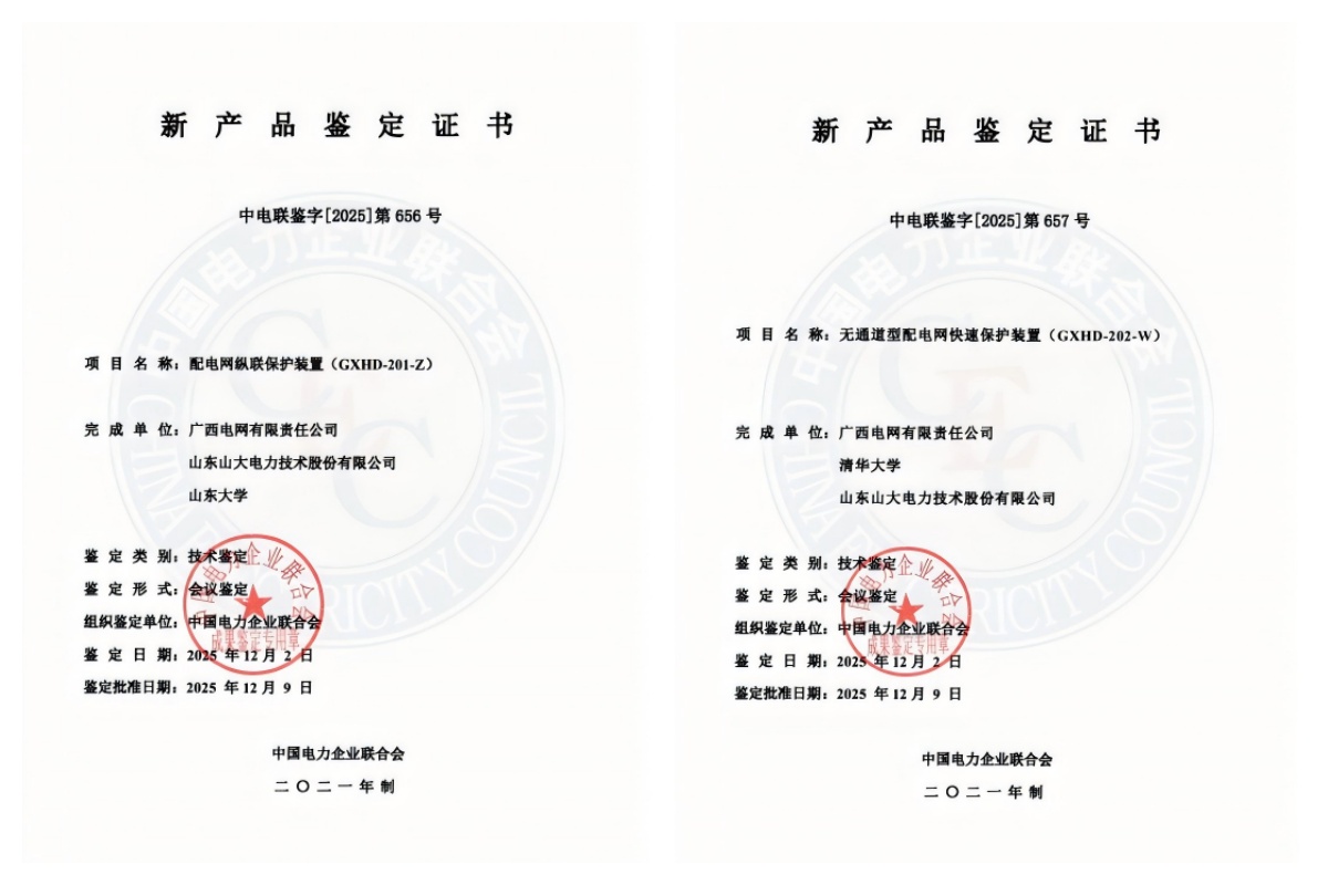 近日,中国电力企业联合会组织召开技术鉴定会,对山大电力公司研发中心配网项目组联合山东大学、清华大学及广西电网调度控制中心共同研发的“配电网纵联保护装置”“无通道型配电网快速保护装置”两款新产品开展全面技术评审。经线上汇报、专业答辩等环节严格考核,两款产品获鉴定委员会高度认可,鉴定结论明确“相关技术性能达到国际领先水平”。